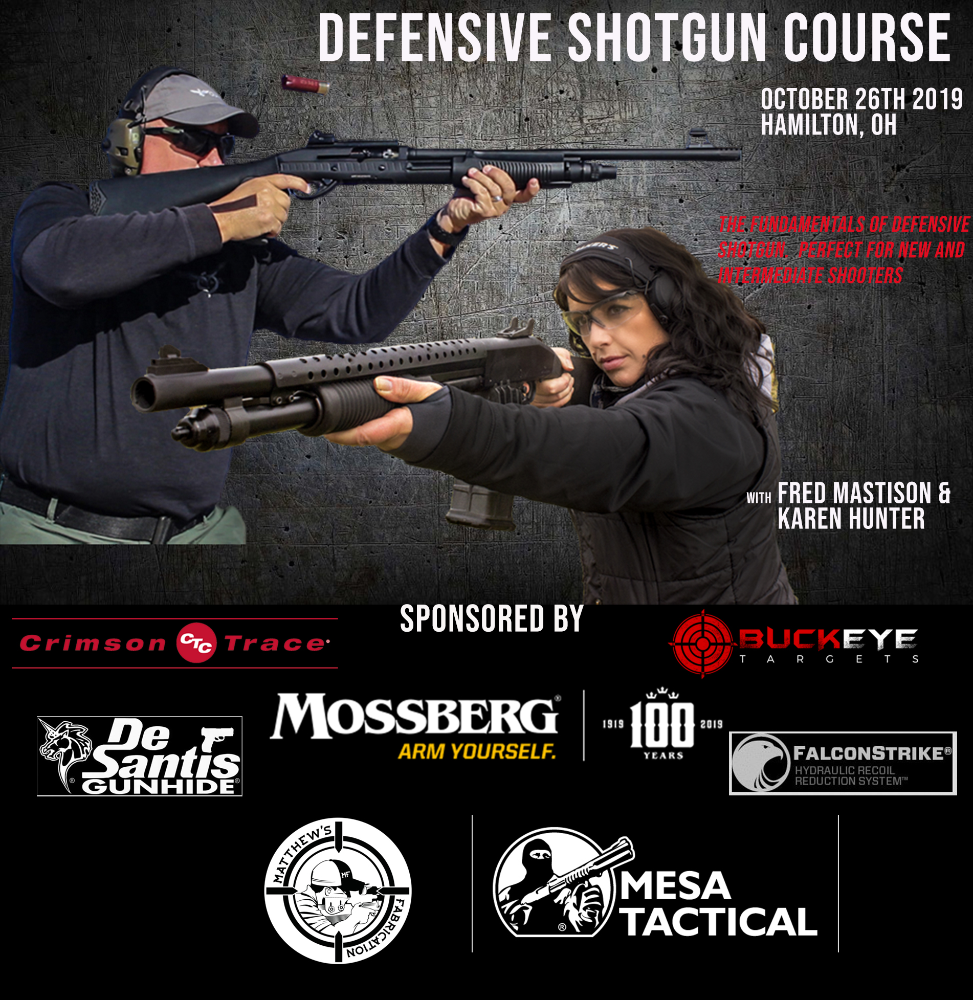We are proud to say that this class is sponsored by Mossberg, Crimson Trace, Buckeye Targets, DeSantis Gunleather, Falcon Strike and Matthews Fabrication!